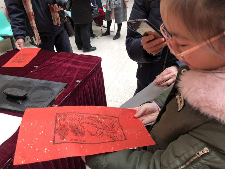 “小朋友,你用这个墨在这个石板上先刷一下,然后把红纸放上去,慢慢地压一下,一幅松鹤延龄就成了。“