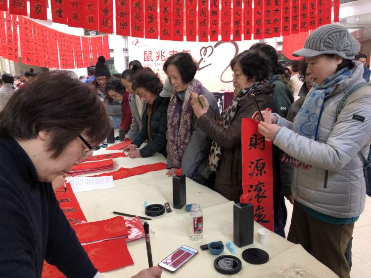 中心内的四周已被居民们提前一天挂满了对联,鲜红一片,喜庆极了。中心内更设了对联、雕版印刷、茶道等中华传统文化专区。你可以向书法大师领上一副对联、也可以亲手体验一把瓦当拓印和雕版印刷术完成的年画。