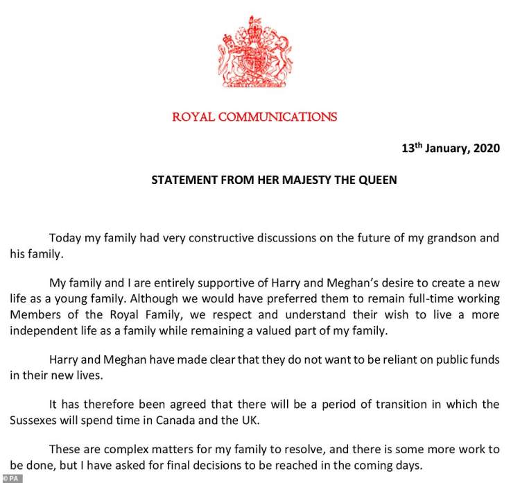 声明说,从现在开始,将给予哈里和梅根一个“过渡时期”,让他们可以在英国和加拿大两地穿梭生活。