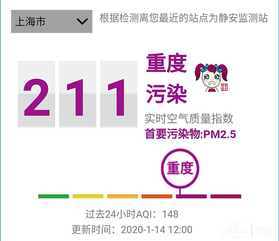 上海今天仍有重度污染,小伙伴们出门记得戴口罩 朱影影 2020-1-14 来源:周到上海 今早周到君看了一眼窗外,平日里通透的滨江变得一片雾蒙蒙。 到了中午,打开上海环境的实时空气质量指数,显示是这样的。 本市自1月13日(昨日)15时起启动空气重污染黄色预警,而今天仍有重度污染。 建议儿童、老年人及心脏病、肺病患者应停留在室内,停止户外运动,一般人群减少户外运动。 来源:周到上海 作者:朱影影 赞一个 (0)