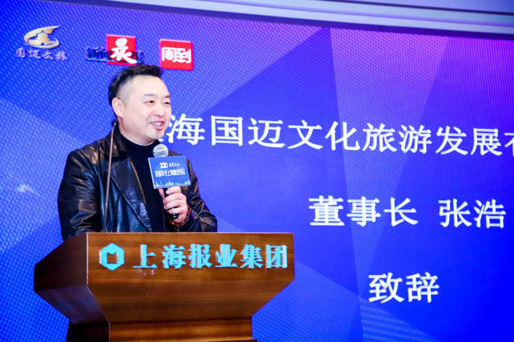发布会现场,新闻晨报周到全媒体经营中心总经理秦川、锦绣江山信息科技股份有限公司上海办事处主任孙涛与上海国迈文化旅游发展有限公司董事长张浩、上海国迈文化旅游发展有限公司总经理李明一起上台点亮启动装置,2020锦绣江山全国旅游年票上海版(又名上海至臻版)就此正式发布。