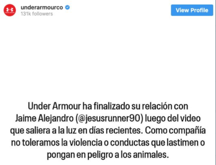 想要挽救形象的亚历杭德罗可谓使出了浑身解数,但面对来自社会各界的指责,他所作的一切只是徒劳。本月早些时候,亚历杭德罗的赞助商安德玛宣布正式与他解约,“作为一家公司,我们不能容忍伤害或危机动物的暴力行为。”