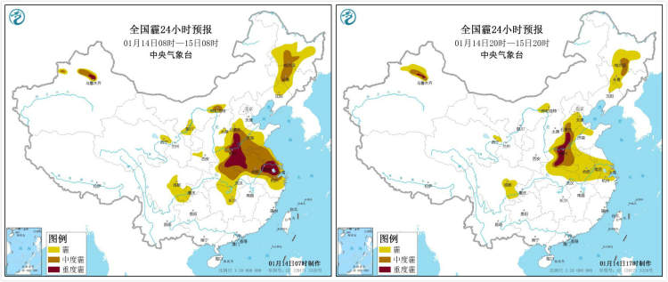 从中央气象台的全国霾24小时预报可见,前后两个不同时间段作对比,上海地区的“霾情”缓解不少。