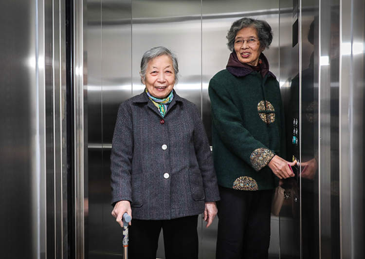 ■临汾社区的居民乘电梯上下楼,十分开心