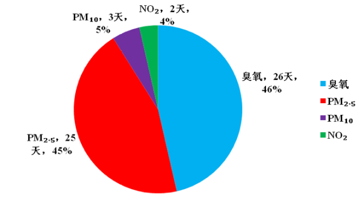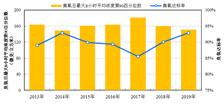 2019年,本市共出现56个污染日。其中,26天以臭氧为首要污染物,占比为46%;25天以PM2.5为首要污染物,占比为45%。臭氧日最大8小时平均浓度第90百分位数为151微克/立方米,达到国家二级标准(160微克/立方米)。