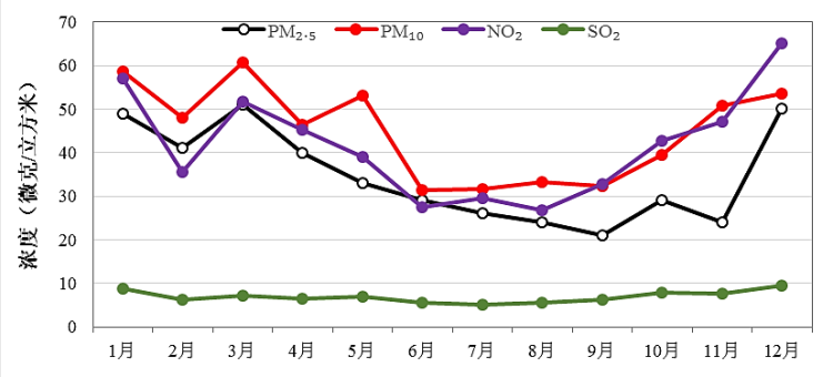 在月度变化上,2019年四项主要污染物总体呈现冬季最高、春秋次之、夏季最低的趋势。