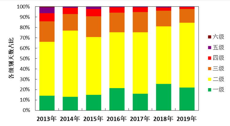 分析2013~2019年的数据,PM2.5等四项主要污染物年均浓度总体呈下降趋势。其中,SO2已连续六年达到国家一级标准,PM10已连续五年达到国家二级标准,并在达标基础上进一步降低。