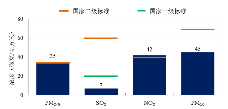 2019年,上海市环境空气六项污染物中,除NO2外,其余五项均达标。其中以年均浓度评价的PM2.5等四项主要污染物中,PM2.5年均浓度为35微克/立方米,达到国家二级标准(35微克/立方米);二氧化硫(SO2)和PM10年均浓度分别为7微克/立方米和45微克/立方米,分别达到国家一级标准(20微克/立方米)和国家二级标准(70微克/立方米);NO2为42微克/立方米,超出国家二级标准(40微克/立方米)2微克/立方米。