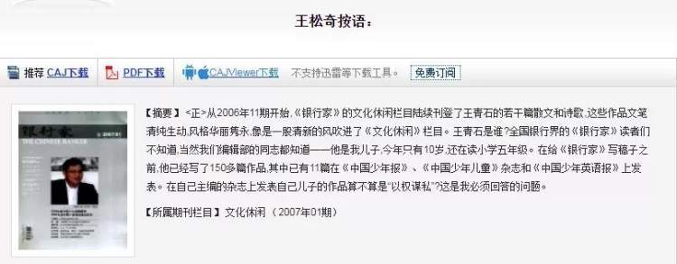 王青石2006年首次在该期刊发表散文和诗歌时年仅10岁,王松奇还曾在该期刊发表《爸爸的话》,推介儿子新书。