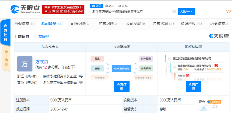 天眼查数据显示,东方生物成立于2005年12月,注册资本9000万元人民币,公司法定代表人方效良(见下图)。