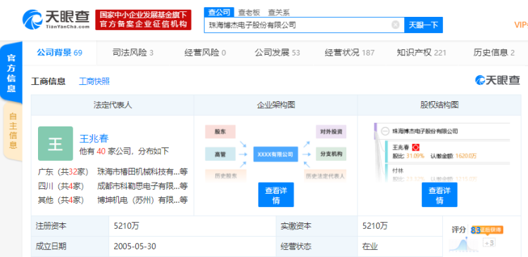 天眼查数据显示,博杰股份成立于2005年5月,注册资本5210万元人民币,公司法定代表人王兆春(见下图)。