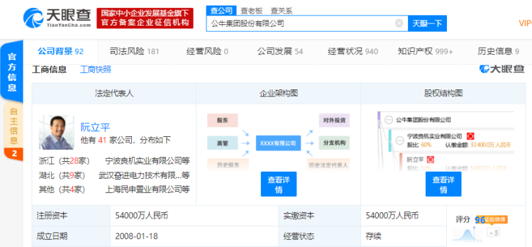 天眼查数据显示,公牛集团成立于2008年1月,注册资本54000万元人民币,公司法定代表人阮立平(见下图)。