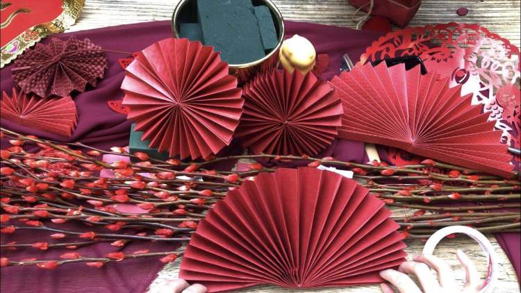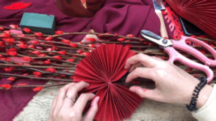 这部分工作家长大可交给小朋友来做,简单说就是把长方形的红纸反复折叠;折成长条后,再对折,把相接的两面粘起来、舒展开,形成一个圆……