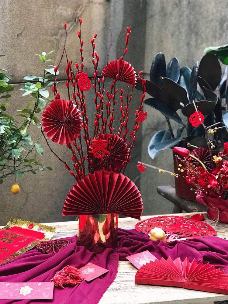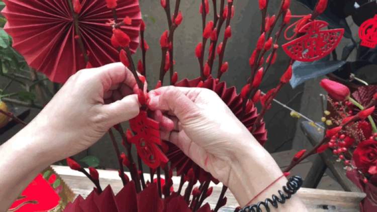 最后再把准备好的小挂件,福字、发财等挂在花枝上,简直可爱又喜庆!