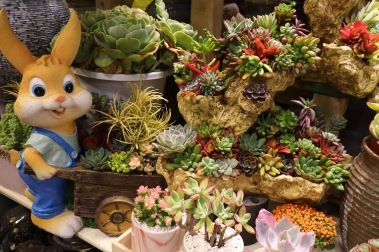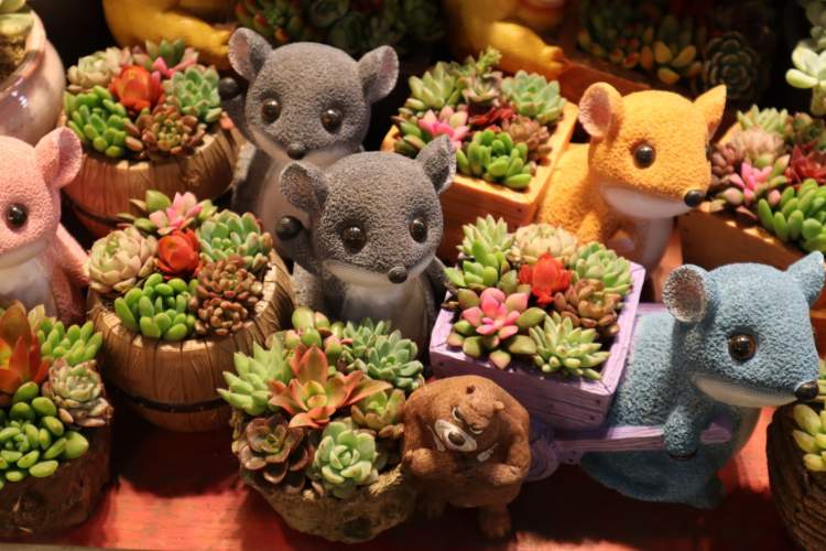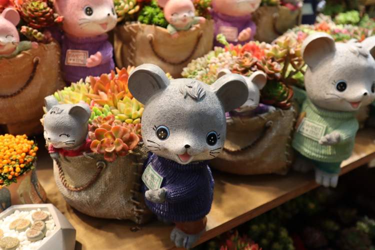 花器方面,因为是鼠年,不少多肉盆栽都是卡通鼠形象的造型!