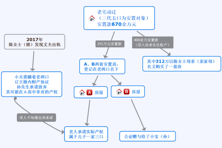 2012年,孙老先生祖宅动迁,他们老两口和儿子孙先生、儿媳陈女士、孙子小宝都是动迁对象,最终得到670余万元补偿。他们用其中255万元拿了A、B两套安置房,登记在老两口名下,剩余安置款中的312万元以陈女士母亲名义购买了一套房。