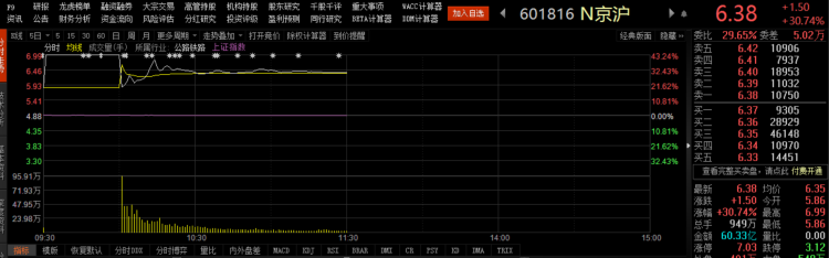 京沪高速铁路股份有限公司(601816)16日在上海证券交易所挂牌,开盘价报5.86元/股,很快跳升43.24%至6.99元触及暂停交易。至上午收盘,京沪高铁股价报6.38元,较每股发行价4.88元高30.74%,换手率36.46%。