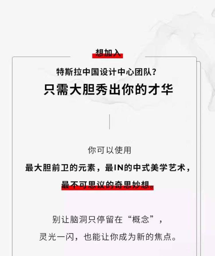 “中国风的特斯拉,将风靡全球。”特斯拉打出的招募设计人才的口号是:“打造原创‘中国风’特斯拉,让最美的中国艺术融入面向未来的特斯拉”。