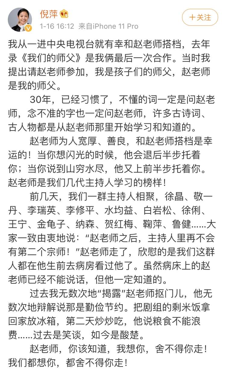 倪萍伤感地写道,过去自己常调侃赵忠祥抠门,如今想来却是酸楚,“赵老师走了,欣慰的是我们这群人都在他生前去病房看过他了。虽然病床上的赵老师已经不能说话,但他一定知道的。”