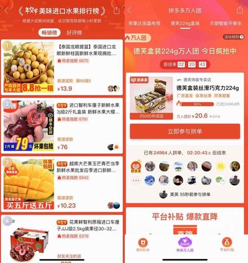 拼多多数据显示,丹东草莓2019年的订单数同比增长了668%,四川不知火丑柑同比增长480%,百香果、雪莲果等南方水果在北方也大受欢迎,更是拼出了一个全国性的大产业。
