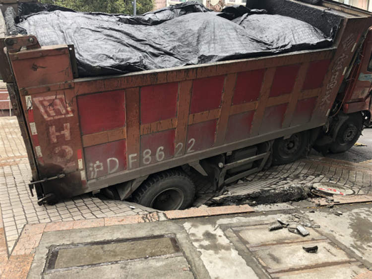 1月17日早7点,普陀区安居朝阳园小区内发生路面塌陷事故,一辆沥青运输货车陷入坑中,暂无人员伤亡。