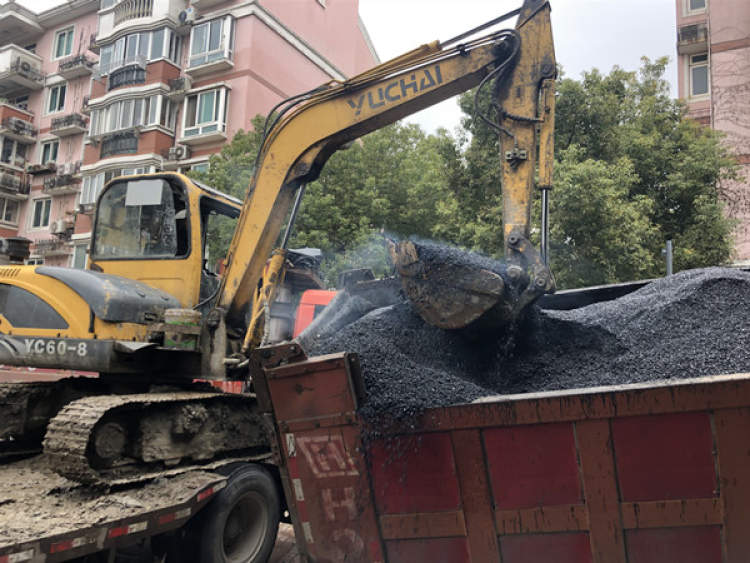 上午9点50分,刘先生调来另一辆空货车,由挖机将涉事货车内的沥青转移至空车。