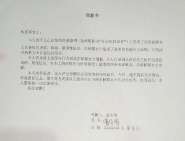 像是王一博,认为自己的名誉被侮辱,将6位网友告上法庭,要求他们公开赔礼道歉,赔偿精神损害抚慰金等;像是郑爽也不忍网友的频繁抹黑,将数名网友告上法庭。此外,还有邓伦、李易峰、杨颖等人。而就在前两天,杨幂维权成功,被告人已经贴文道歉。