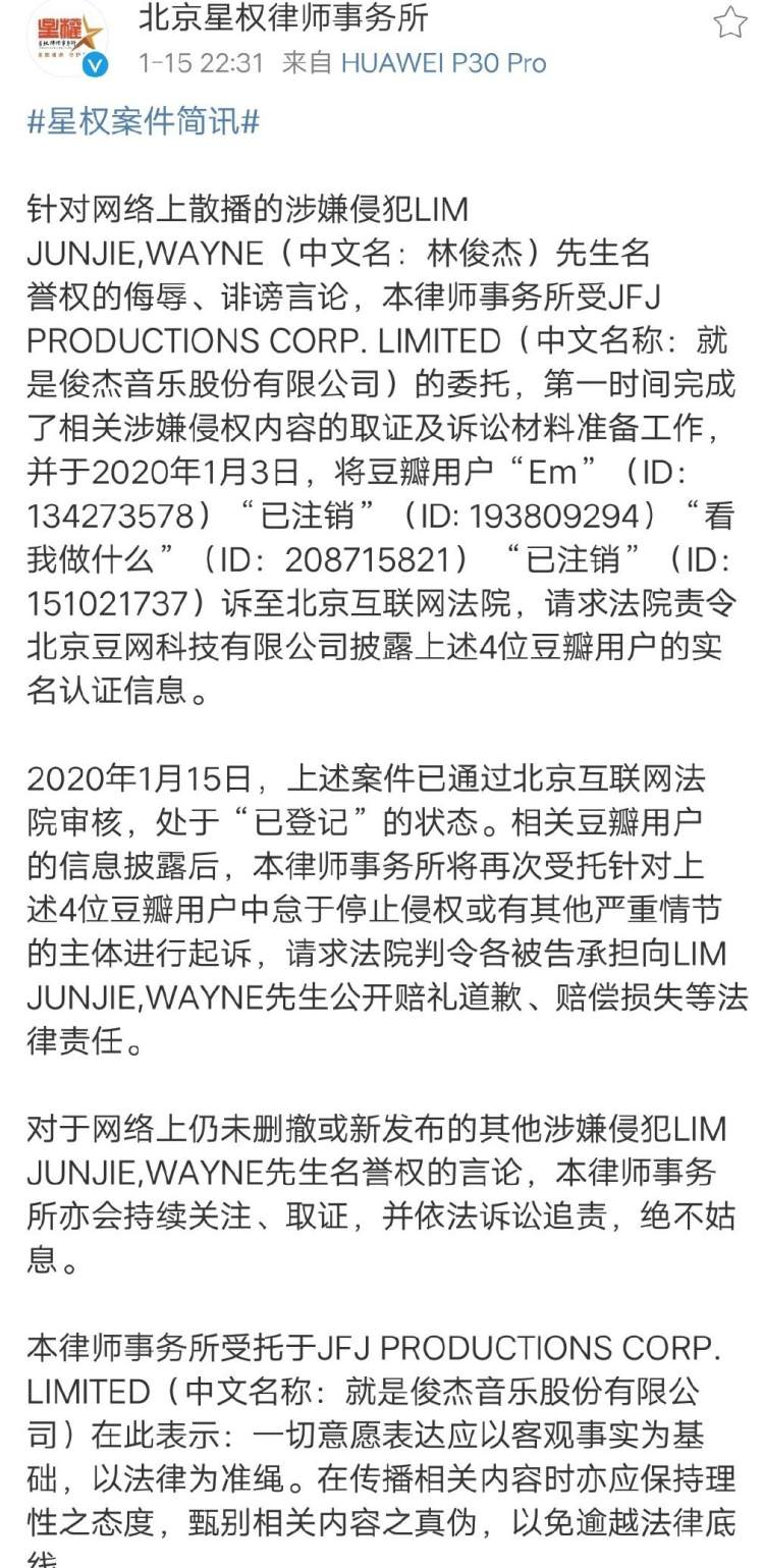 昨日,有律师事务所对外公布:针对网络上散播的涉嫌侵犯林俊杰名誉权的侮辱、诽谤言论的案件,已通过北京互联网法院的审核。律师请求法院判令四名网友向林俊杰公开赔礼道歉、赔偿损失等法律责任。