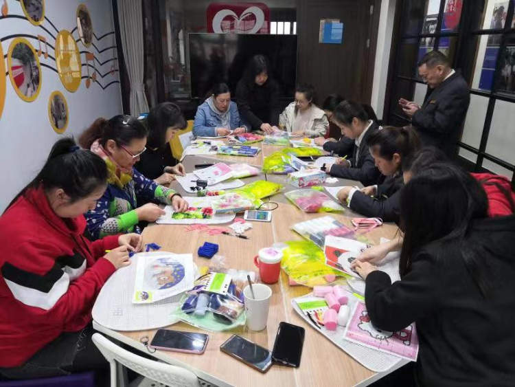 ▲白领和居委干部一起赶制垫子