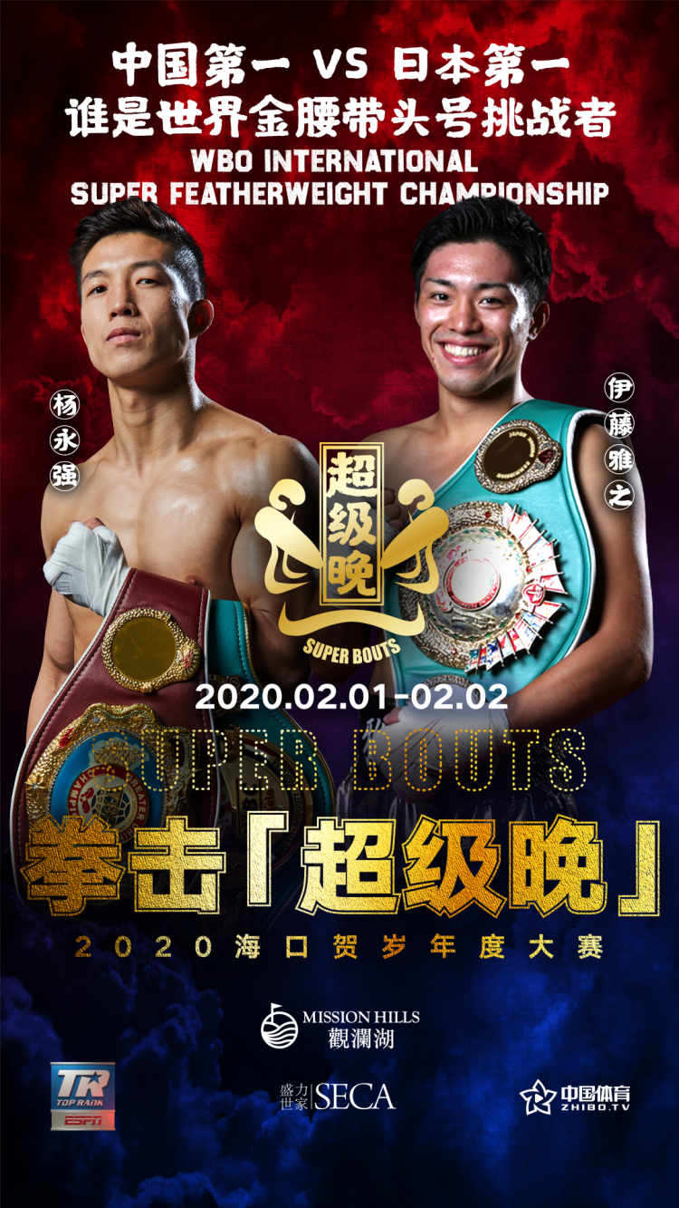 2月2日,拳力联盟一线拳手、中国排名第一的杨永强将与日本超羽量级第一伊藤雅之在“超级晚”世界拳王争霸赛的舞台上,争夺WBO超羽量级国际金腰带,胜者将成为WBO世界金腰带的头号挑战者。这是杨永强冲进世界一线拳手行列最重要的一次机会,也是中国超羽量级拳手最勇敢的一次尝试。