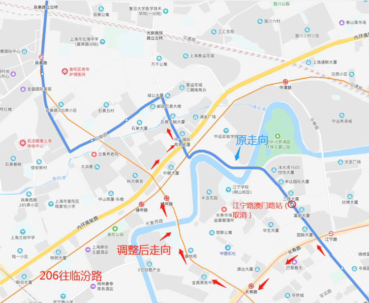 206路下行往西康路南京西路方向,自临汾路阳泉路(彭浦新村)起循原线至中山北路、镇坪路、常德路、长寿路、江宁路循原线至西康路南京西路止。上行临时撤销江宁路澳门路站;下行临时撤销江宁路澳门路站、中山北路光新路站。