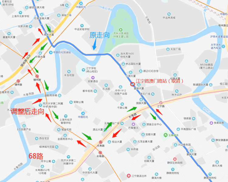 临时调整后,68路上行往丰宝路聚丰园路方向,自昌化路武定路起经武定路、江宁路、长寿路、常德路、镇坪路、中山北路、光新路循原线至丰宝路聚丰园路止;下行往昌化路武定路方向,自丰宝路聚丰园路起循原线至光新路、中山北路、镇坪路、常德路、长寿路、江宁路循原线至昌化路武定路止。上行、下行皆临时撤销江宁路澳门路站。