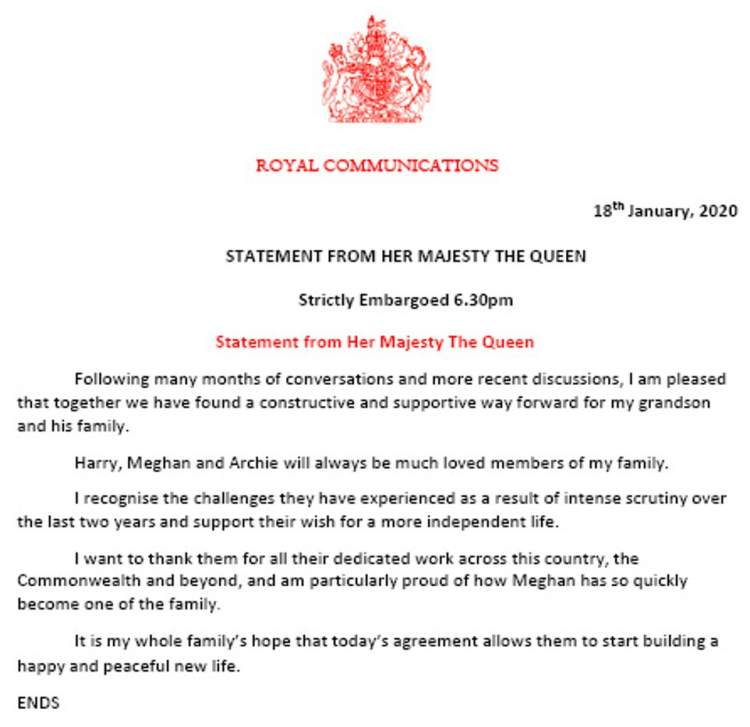 女王还表示,她认识到两人在过去两年,因为公众的高度关注而承受了巨大压力,支持他们对于更加独立生活的愿望,希望他们能开始打造幸福安宁的新生活。
