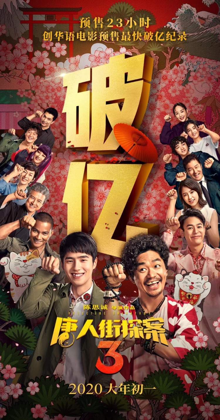根据官方公布的数据,《唐人街探案3》预售23小时后,即昨晚总预售票房就成功破亿,创造了华语电影预售最快破亿纪录。