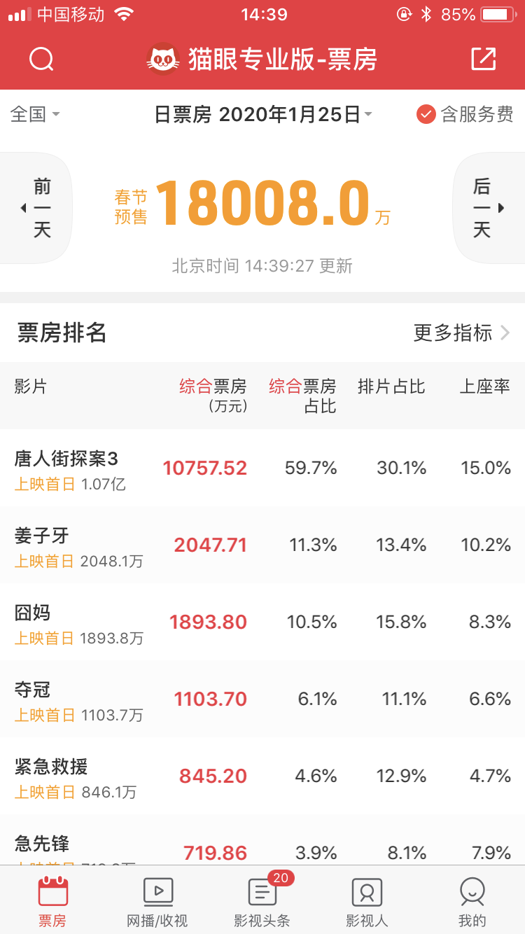 《唐人街探案3》遥遥领先,目前排在预售票房第二和第三位的都是动画电影,《熊出没·狂野大陆》预售总票房已突破4000万元,而《姜子牙》预售总票房均则突破2000万元大关,达到2373万元。