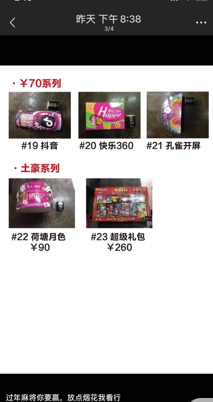 “过年麻将你要赢,放点烟花我看行”、“想要一年有钱花,过年还得放烟花”……这是嘉定一男子张某朋友圈里自编的顺口溜,在他的朋友圈里还晒着各种类型明码标价的烟花爆竹。
