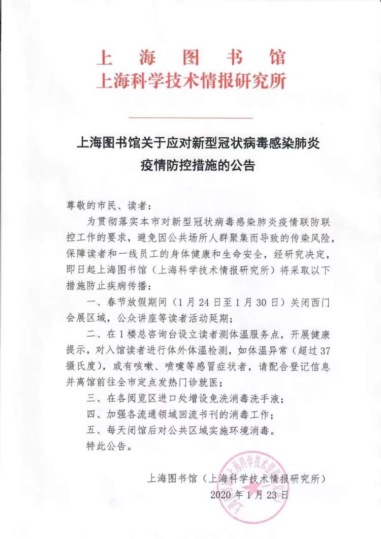 上海图书馆关于应对新型冠状病毒感染肺炎疫情防控措施的公告