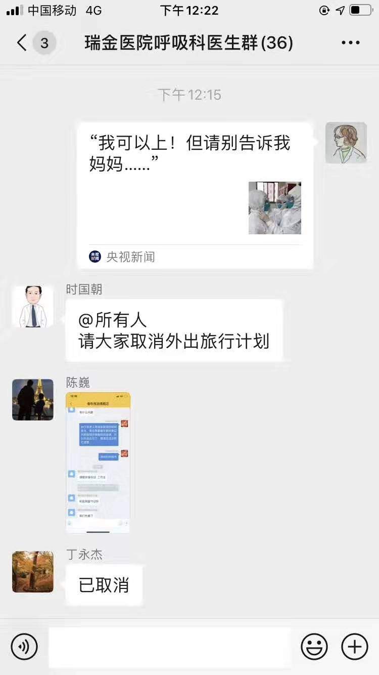 这是瑞金医院呼吸科医生的群,瑞金医院呼吸科主任时国朝发了一句,“请大家取消外出旅行计划,下面一排回答:已取消。”