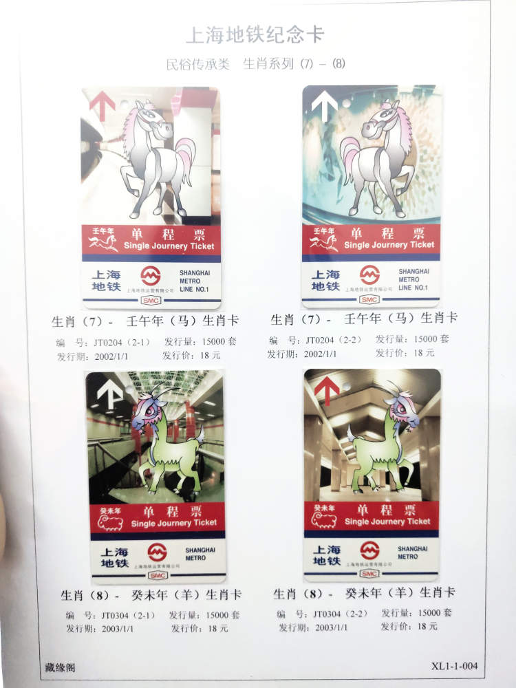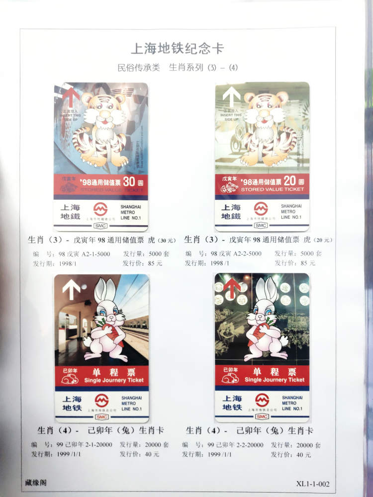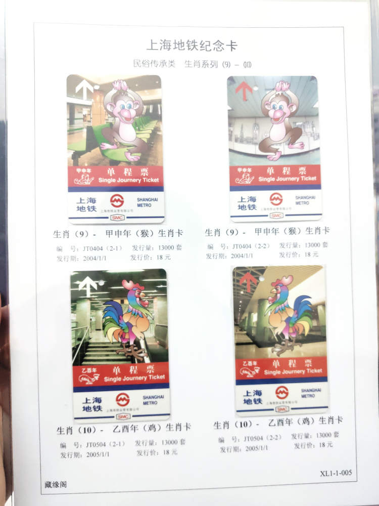 ▲1996-2005年上海地铁纪念卡生肖系列通用储值票、单程票