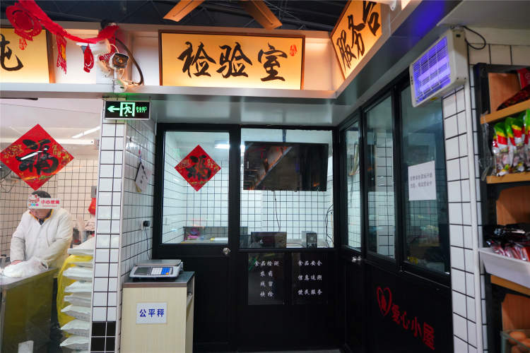 居民如果想要监测蔬菜肉类是否健康、安全,可以拿到角落里的检验室请工作人员检验。