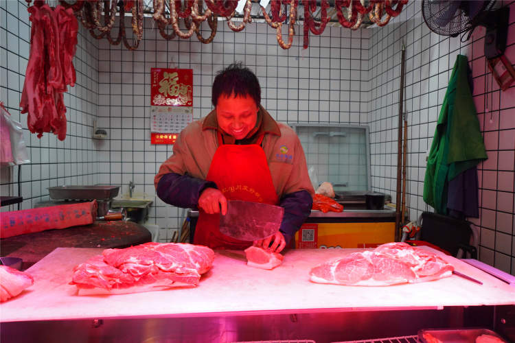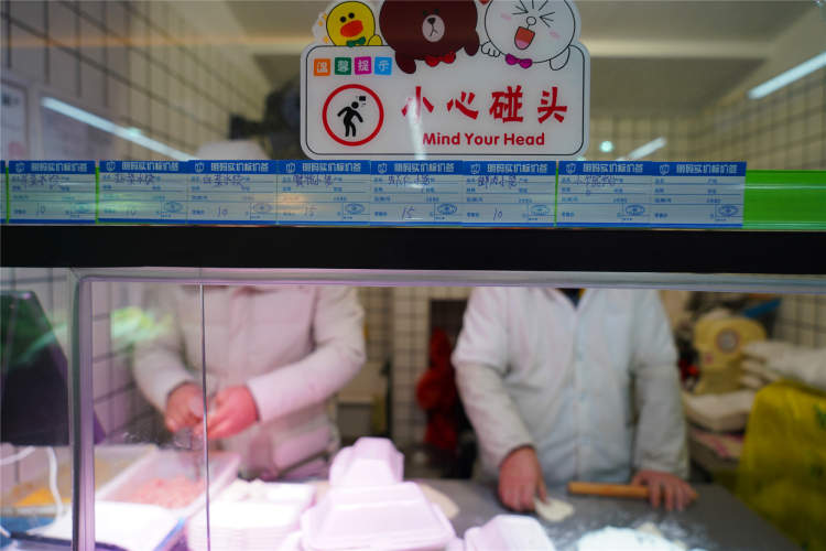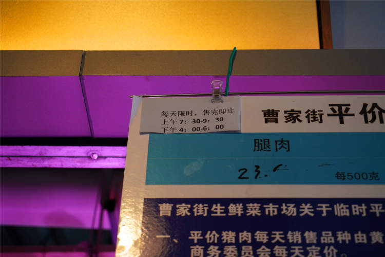 菜场里有几家猪肉铺,每天限时限量供应平价猪肉。目前,腿肉、夹心肉都是23元一斤,每天每人只能购买平价猪肉品种一公斤。每天上午7:30—9:30,下午4:00—6:00限时出售,售完即止。