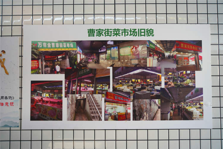 墙上贴着曹家街菜市场旧貌的组图,如今一切换新颜,照片成了附近居民共同的回忆。