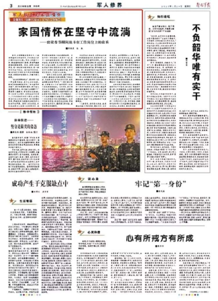 “人海茫茫,你不会认识我,我在遥远的路上风雨兼程;霓虹闪闪,你不会发现我,我在高高的山上戴月披星;花海柳浪,你不会找到我,我在天上默默地飞,我在水里悄悄地行。我情牵着你,我梦绕着你,情牵梦绕是那军人魂……”新春佳节,军人在平凡岗位上履职尽责,寂寞的守候和坚定的守望在此时汇聚成了一首无言的诗,绘成了一幅壮美的画,谱成了一首激昂的歌,如和煦的春风在山川间吹拂,如绵绵的春雨在原野中飘落。那万千军人在万家团圆时仍坚守岗位的身影,也由此深深镌刻在了无数人的脑海里。