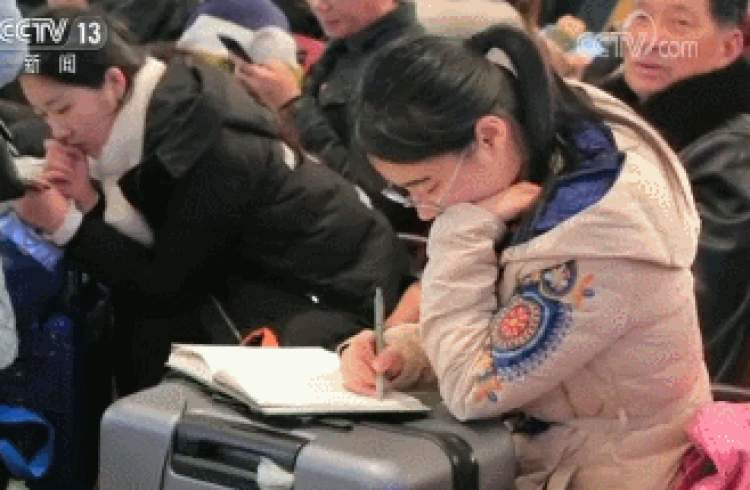 在嘈杂的人群中,我们发现了一个有些特别的女孩儿。她正倚着行李箱边看书边做注解。交谈中我们得知,学校刚放假,她就急着买票回家了。