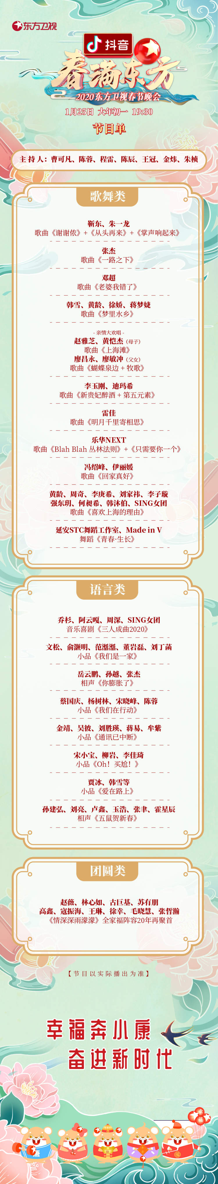 就在刚刚,本次晚会的节目单新鲜出炉,精彩纷呈的节目令人期待。节目将于1月25日大年初一晚19:30与全国观众见面。
