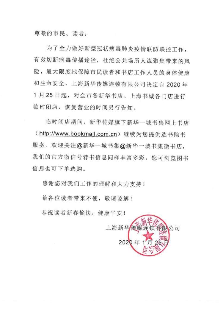 上海各新华书店、上海书城明起临时闭店 徐颖 2020-1-24 来源:周到上海 1月24日,上海新华传媒连锁有限公司决定,自2020年1月25日起,对全市各新华书店、上海书城各门店进行临时闭店,恢复营业的时间另行通知。全文如下: 来源:周到上海 作者:徐颖 赞一个 (0)