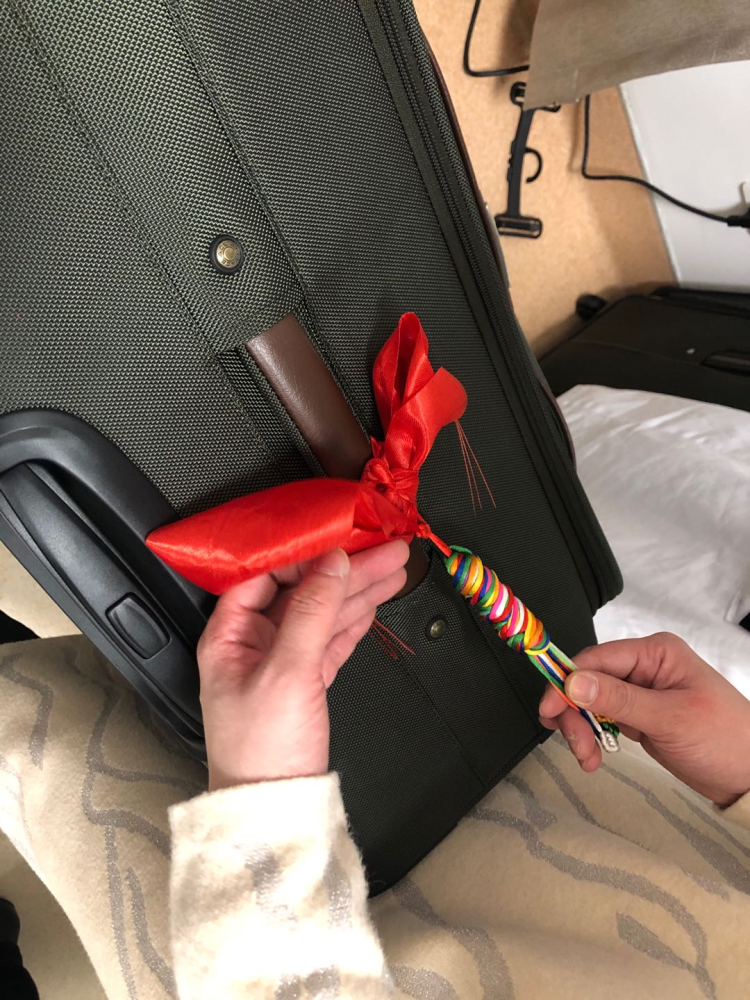 箱子上的心有千千结是同事们在箱子上系的,祈福平安