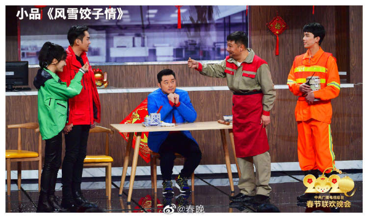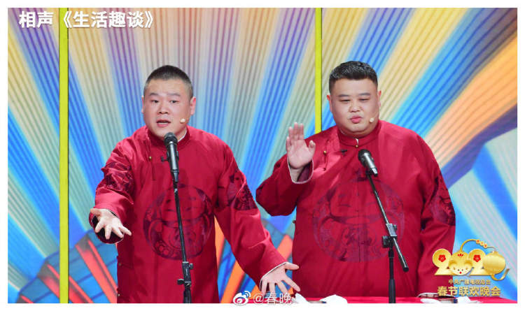 此外,第四次上春晚的岳云鹏和孙悦带来了相声《生活趣谈》,岳云鹏贱萌的表情一如既往,两人彼此调侃《五环之歌》的画面也亲切熟悉。