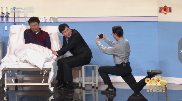 同样是春晚老朋友的沈腾,则活灵活现地诠释了一个装腔作势的“科长”形象。看望病人,他从进门开始的每一个动作几乎都是表演:请群众反映情况,回复的却全是套路;与群众合影留念,还专门留下空白想把上级领导P图加上。