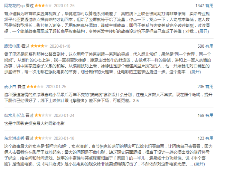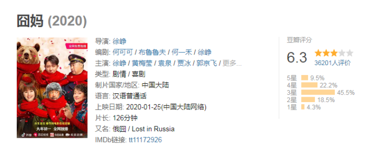 如果抛开行业影响,回归影片本身,《囧妈》同样面临争议:截至记者发稿时,该片豆瓣评分仅为6.3,比5.7的《港囧》高,但低于7.4分的《泰囧》。目前,打三星的观众最多,影片的整体评价不高。